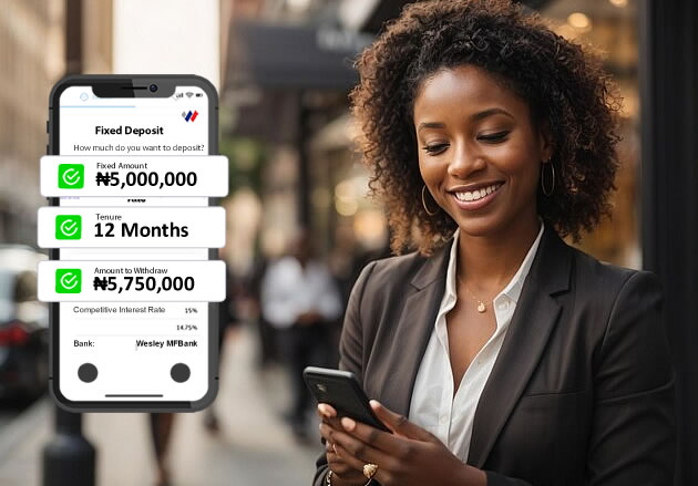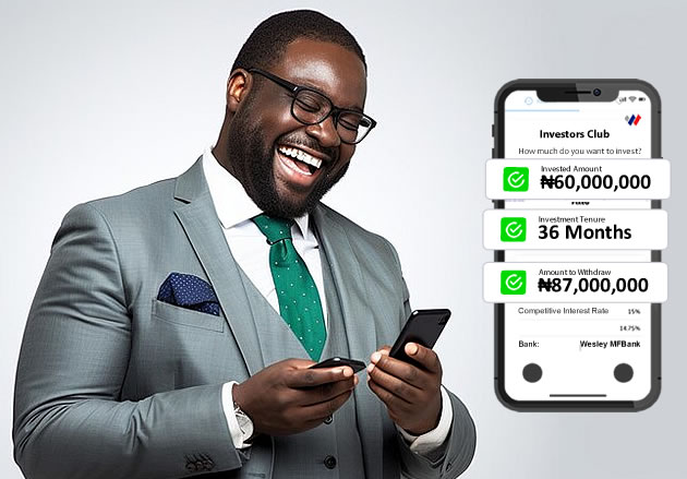 Our investment products gives you the opportunity to grow your wealth and earn high returns on investment. Choose from our simple, all-inclusive portfolios prices. Invest minimum of ₦100,000 – ₦5,000,000 Invest amount above ₦5,000,001 – ₦49,999,999 Invest amount above ₦50,000,000 (with insurance benefit) At Wesley Bank, we offer churches and charities a range of deposit accounts designed to suit a variety of needs. When you entrust your organization’s money to us, you can be confident that it is being put to work in growing God’s Kingdom. or visit the Playstore or App Store to download the Wesley app and get started. Provide your email and phone number and verify your phone number with an OTP. Select username & password. Provide your BVN & KYC details and start verification. Fund your account and make transactions – transfer, buy airtime or pay bills.